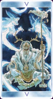 The Heirophant who often shape shifts in modern decks is also a force as the Hunter of Demons complete wth his skulls and antlers.